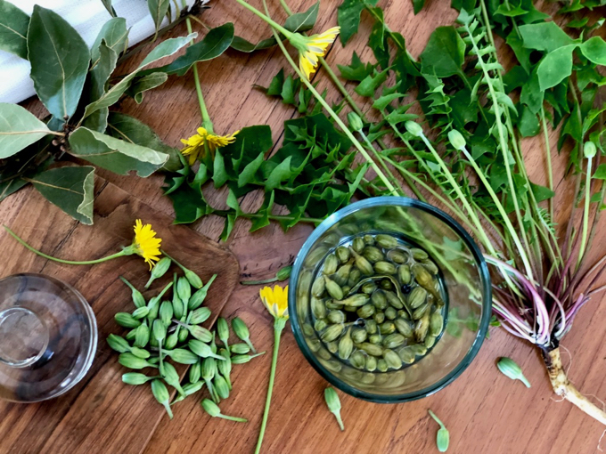 - Collect dandelion buds and place them in a glass jar. Add 1 bay leaf, 4 whole black peppercorns, and 1 minced garlic.