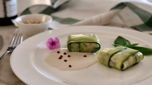 Modern recipe based on Japanese Shōjin Ryori techniques. Shōjin zucchini consist of small packets of zucchini sheets stuffed with vegetables and sided by a rich sesame cream.