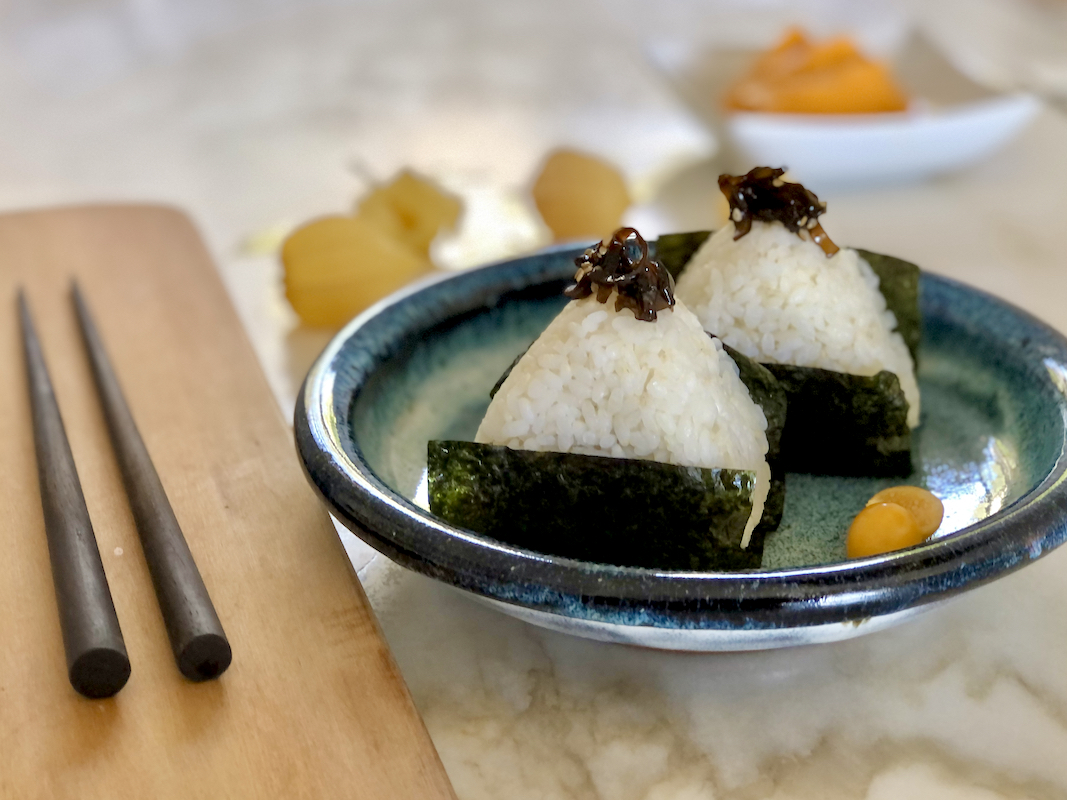 This is interesting as in today’s contemporary cooking this concept is called Upcycling (transforming an ingredient leftover in a new dish). Today we are going to see an ancient technique of upcycling used to make Kombu Onigiri (traditional Japanese rice cakes). Kombu seaweed is used to flavour the rice and, once cooked, transformed into Tsukudani (a type of preserve) with which we will fill and decorate the onigiri. The resulting snack is a classic dish, amazing for its simplicity and harmony of flavors.
