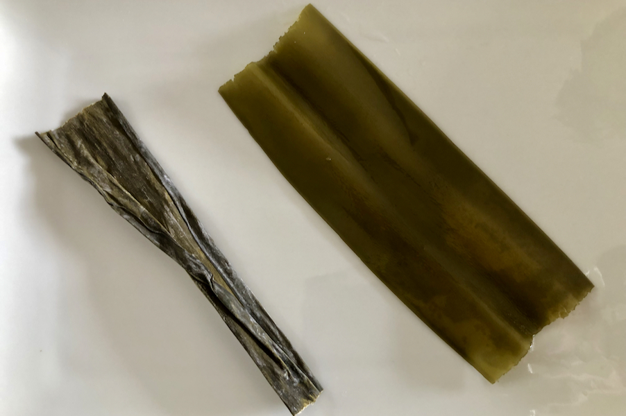 Kombu sheet before and after being rehydrated