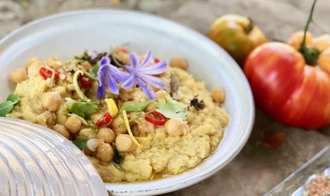 Our Hummus is the easiest and fastest recipe to make of all the ones we have published. To give it a touch of its own, we refresh it with lemon peel and ginger and we also brighten it with an aromatic dressing: garlic and fresh coriander. On top, a good dose of the same whole chickpeas and a good splash of EVOO. It’s what we call a Maximized Hummus.