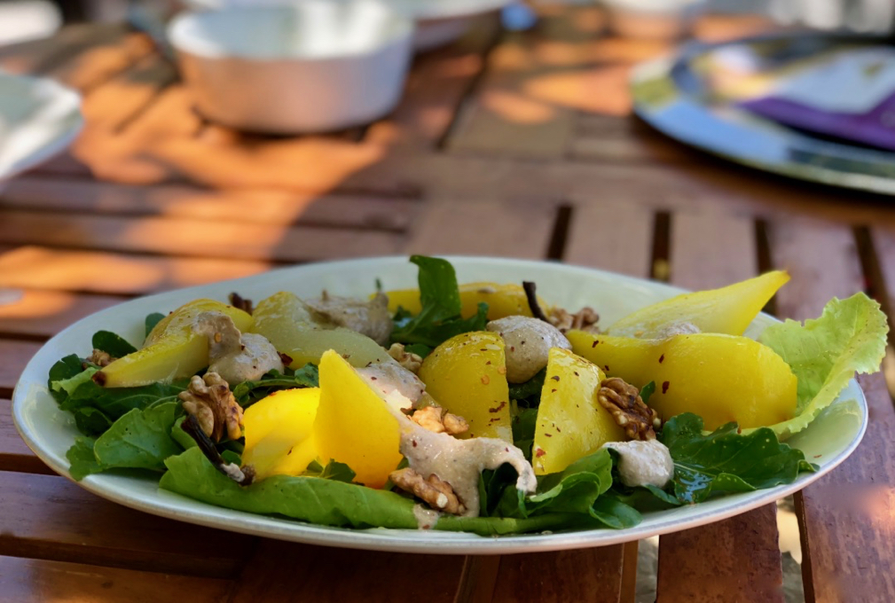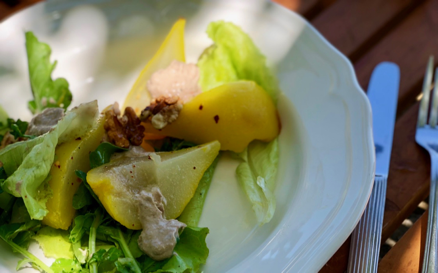 Ah!, here we smile and continue with the recipe. The walnut tahini is a great idea, we replace the sesame with slightly roasted walnuts, extraordinary flavor. With the pears infused with saffron contrasting with the green leaves’ bitter flavors (arugula, endive) the dish is a vegetable and pan-Mediterranean experience. Refreshing, contemporary and classic at the same time. Nothing to envy … to nothing.