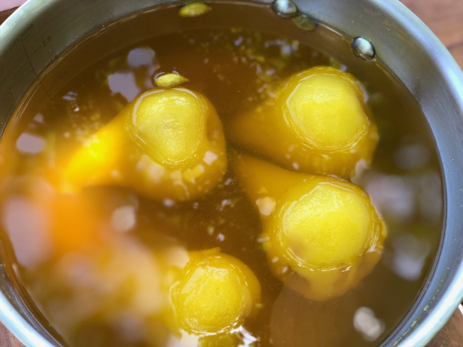 - Place all the ingredients for the poached pears in a small pan. Add 1 litre of water and bring to the boil. Lower the heat and simmer for 10 minutes.