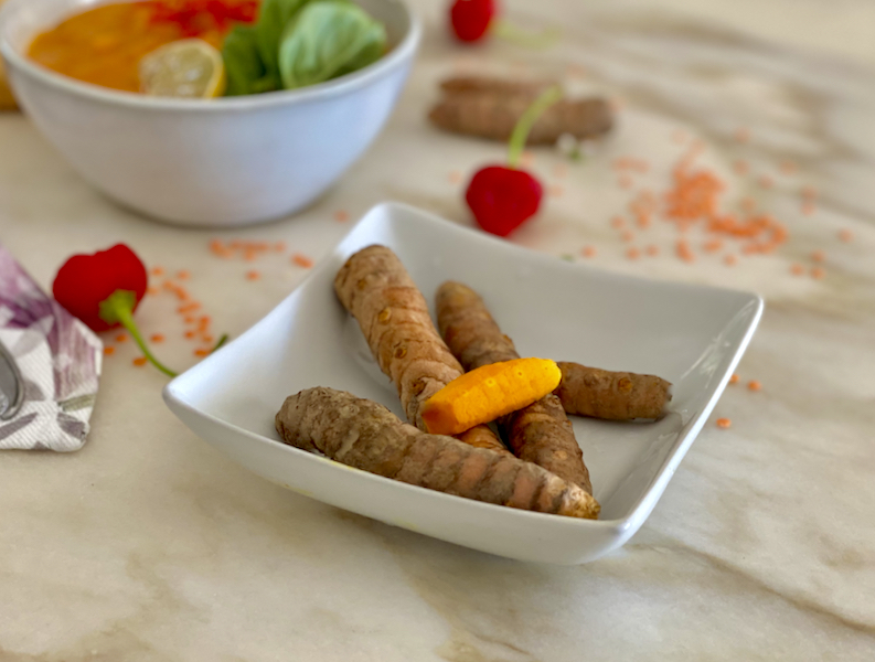 - 3-inch (7.5 cm) piece fresh turmeric, peeled, or 2 teaspoons (10 mL) ground turmeric
