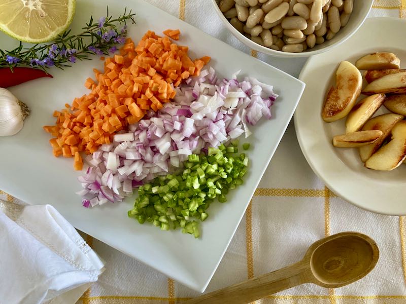 - In a pot add the olive oil and a sprig of rosemary. Gently fry the onion, garlic, celery and carrot (about 5 minutes).