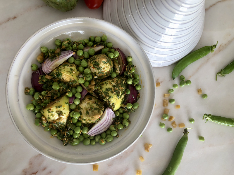 Los que hemos tenido la suerte de visitar Marruecos siempre nos hemos sorprendido por la delicadeza de sus verduras cocinadas en el Tajine. Zanahorias, calabacines, nabos o judías verdes, aromatizadas con hierbas frescas y especias y elaboradas en su punto justo de cocción. El tajine o tayín (del bereber ⵟⴰⵊⵉⵏ ) es un recipiente circular de barro cocido con una tapa cónica y que da nombre a los platos cocinados en él. Hoy os traemos un Tajine de Alcachofas con Guisantes, un plato tradicional del Mediterráneo Sur, icónico por sus sabores frescos y que nos permite cocinar con una de las técnicas más saludables, vapor y baja temperatura.